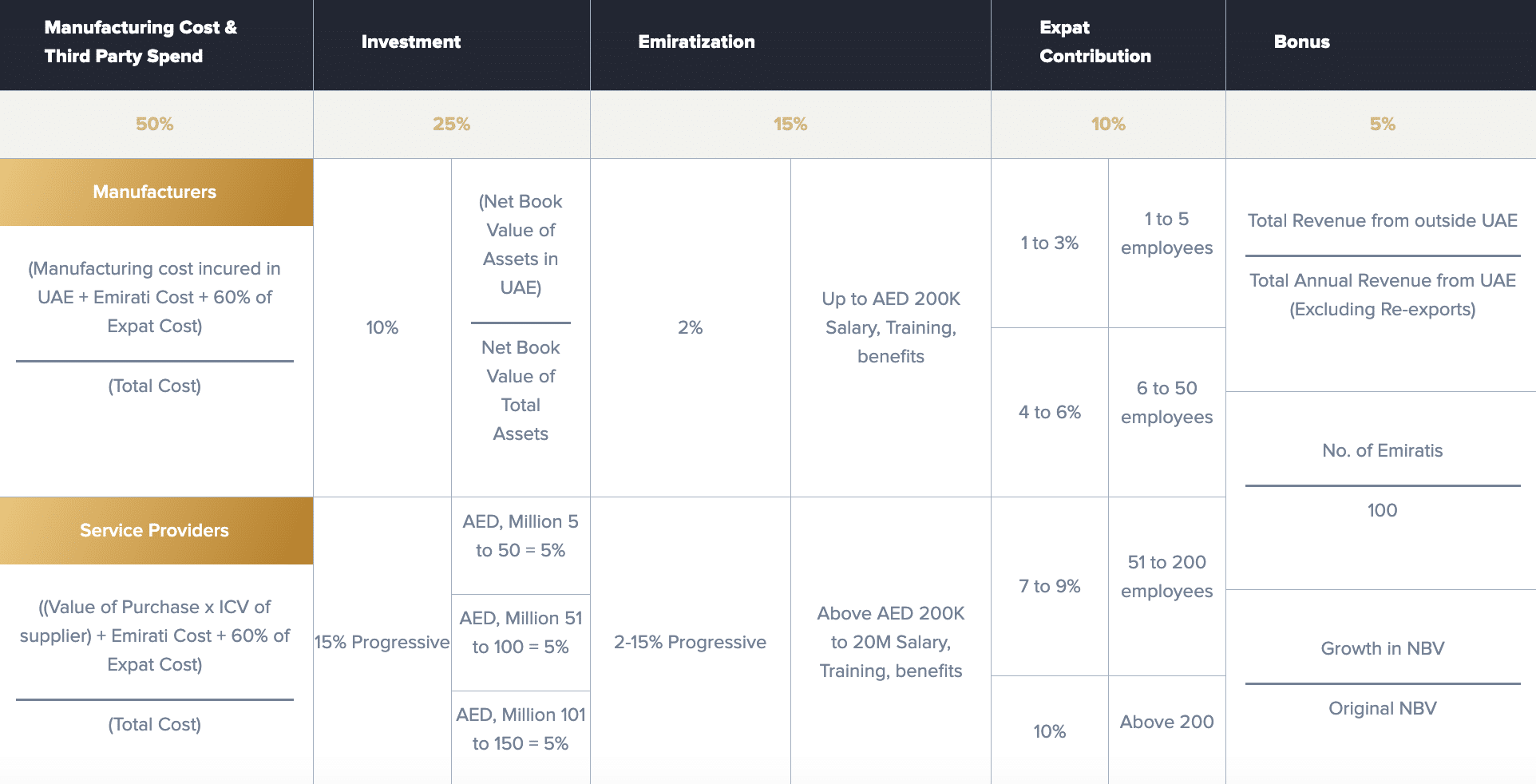 The ICV score is calculated based on several criteria which play a major role in driving economic growth and development in the UAE. These are: